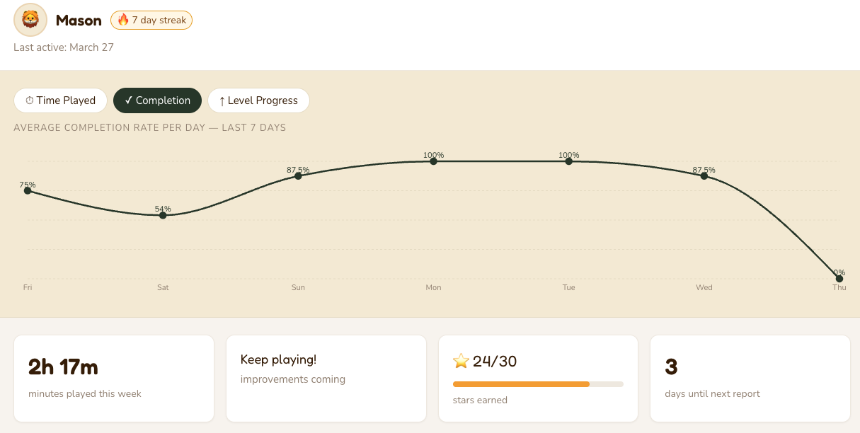 First report appears the following Sunday, once your child completes 3 sessions across at least 2 games.